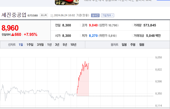 2024.06.24 09:42 / [특징주]세진중공업, 2022년 이후 최고가…'조선3사 납품' 세계 1...-아시아경제 / https://n.news.naver.com/mnews/article/277/0005435853