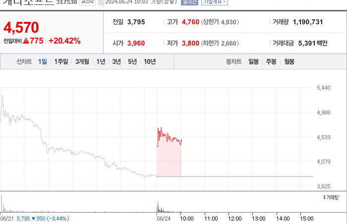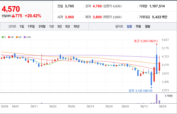 4,300시총: 1조 4,568억원, 거래량:157,402, 거래대금:10,053백만