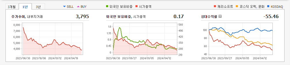2024년 3월 전년동기 대비 연결기준 매출액은 58.4% 감소, 영업손실은 153.7% 증가, 당기순손실은 56.3% 증가. '캐리'로 통칭되는 콘텐츠IP, 브랜드, 미디어 역량을 기반으로 애니메이션, 블록체인 기반 메타버스 게임 등으로 사업모델을 확대 중임. 영어교육 프로그램인 ‘캐리영어’를 개발 완료하여 ‘2023 광주 ACE fair(에이스 페어)’에 참가. 어린이 영어교육의 새로운 시도이자, 캐리IP 사업의 확장 기대됨.