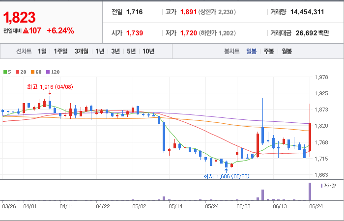 1,800시총: 3,272억원, 거래량:1,950,311, 거래대금:30,428백만