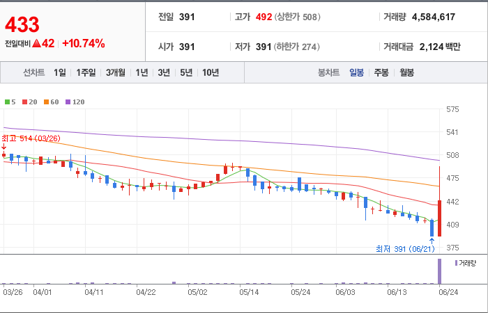 260시총: 436억원, 거래량:111,201, 거래대금:379백만