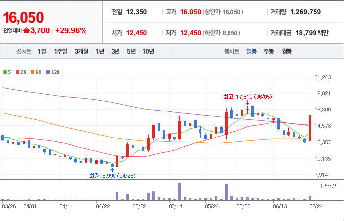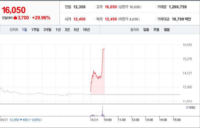 현재가: 16,050, 어제대비:+상한가