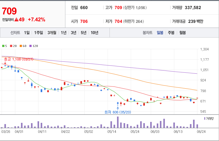 현재가: 707, 어제대비:+상승