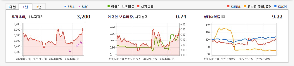 2024년 3월 전년동기 대비 연결기준 매출액은 25.5% 감소, 영업손실은 76% 감소, 당기순손실은 66.6% 감소. 전방 산업인 건설경기 침체의 장기화 및 국내 시장 공급 과잉에 따른 경쟁심화로 MDF, 제재 부문 생산이 중단으로 고정비 절감에 따른 재무구조 개선 기대. 선앤엘인테리어는 안산시 부지, 건물에 대한 매각을 진행하여 생산설비는 SUN&L Vietnam으로 일부 이전 및 판매, 폐기되어 현재 국내 생산설비는 없음.