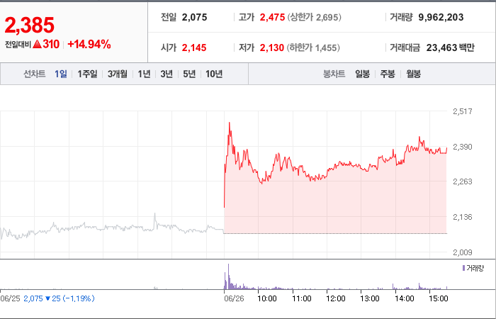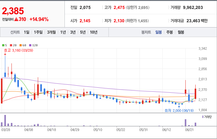 2,160시총: 1,581억원, 거래량:14,410,415, 거래대금:278,478백만