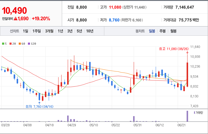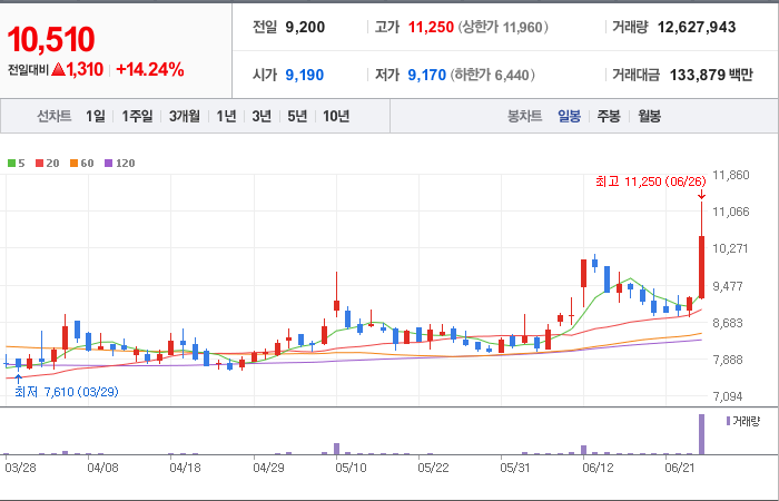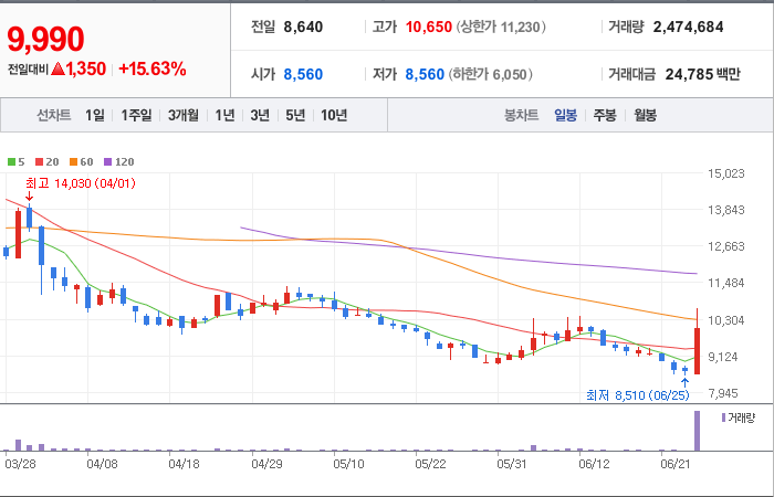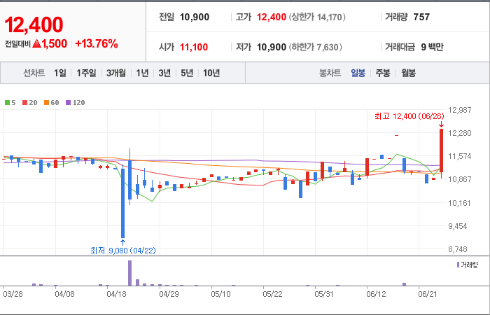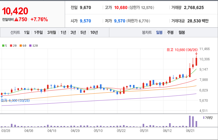 750시총: 5,924억원, 거래량:2,768,625, 거래대금:28,530백만
