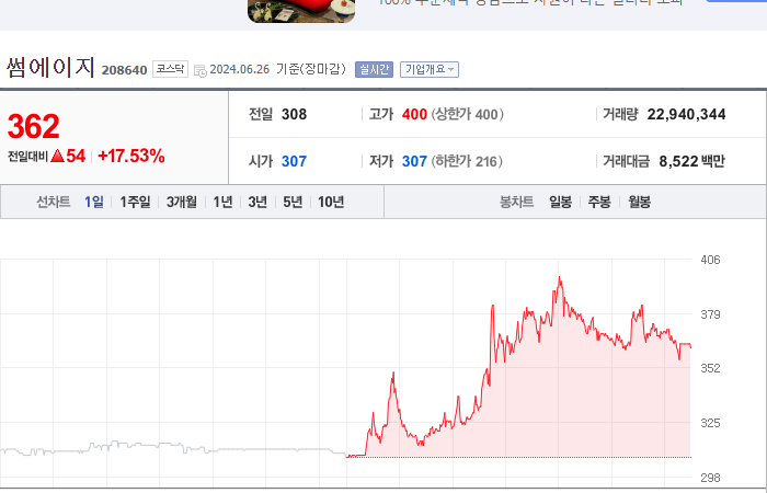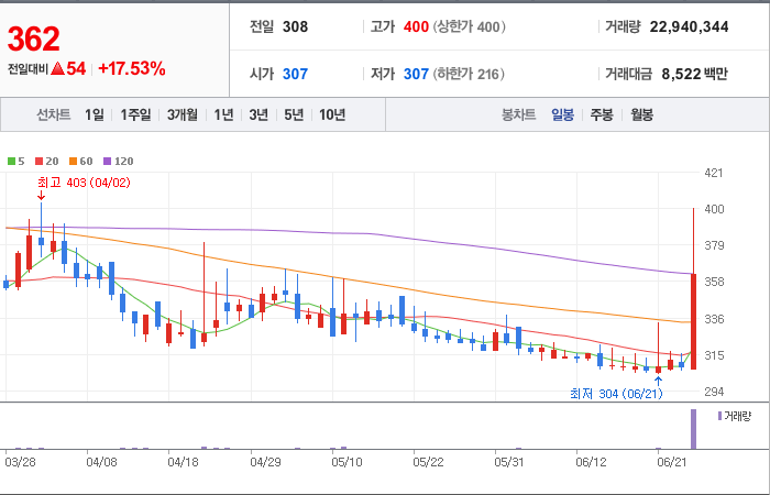 54시총: 504억원, 거래량:22,940,344, 거래대금:8,522백만