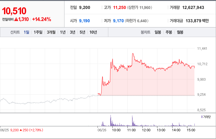 1,310시총: 1,954억원, 거래량:12,627,943, 거래대금:133,879백만
