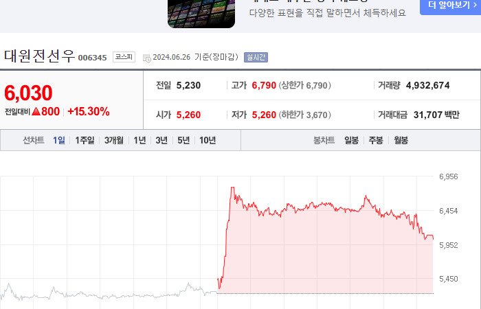 2024.06.26 13:14 / [한경유레카 특징주] 대원전선, 美 전력청 수출 기대-한국경제 / https://n.news.naver.com/mnews/article/015/0005002067