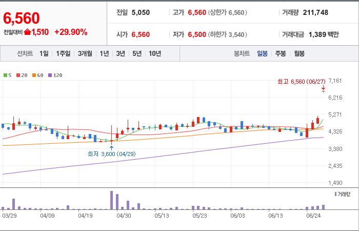 4,290시총: 1,373억원, 거래량:3,964, 거래대금:218백만