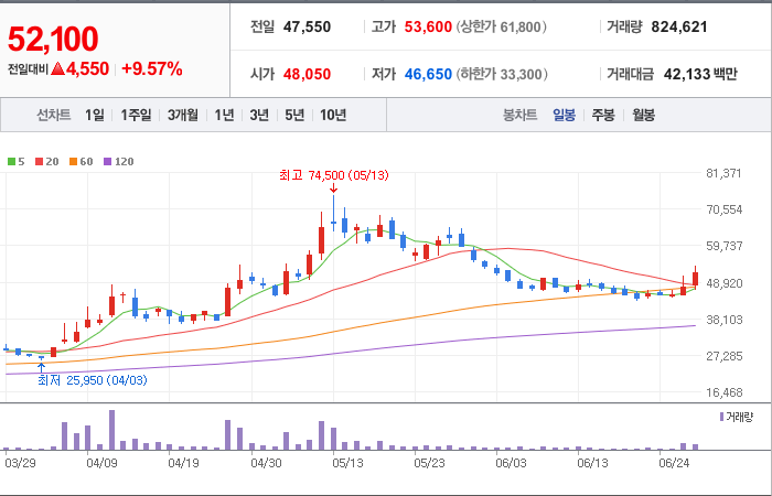 4,150시총: 3,804억원, 거래량:811,948, 거래대금:41,478백만