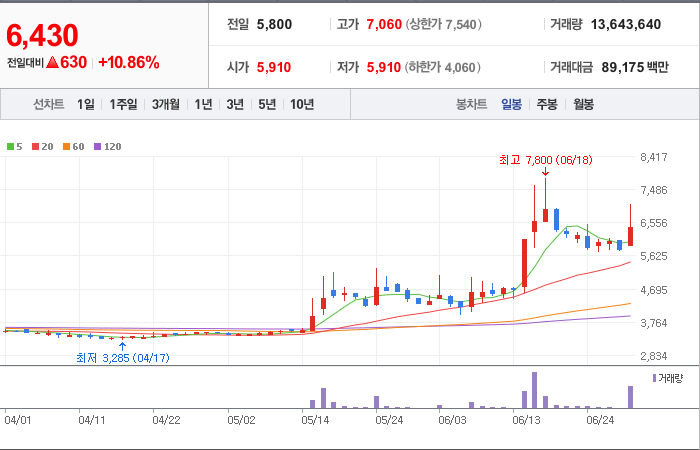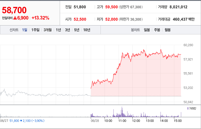 6,900시총: 3조 7,126억원, 거래량:8,021,012, 거래대금:460,437백만