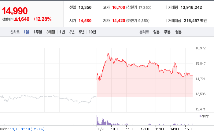 16,800시총: 8,330억원, 거래량:860,358, 거래대금:73,742백만