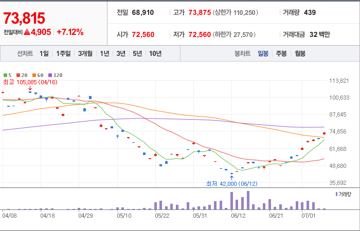 6,900시총: 14조 409억원, 거래량:579,520, 거래대금:59,620백만