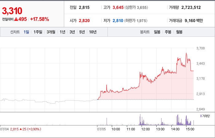 3,340시총: 5,956억원, 거래량:2,175,141, 거래대금:45,431백만