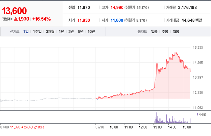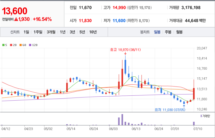 현재가: 13,600, 어제대비:+상승