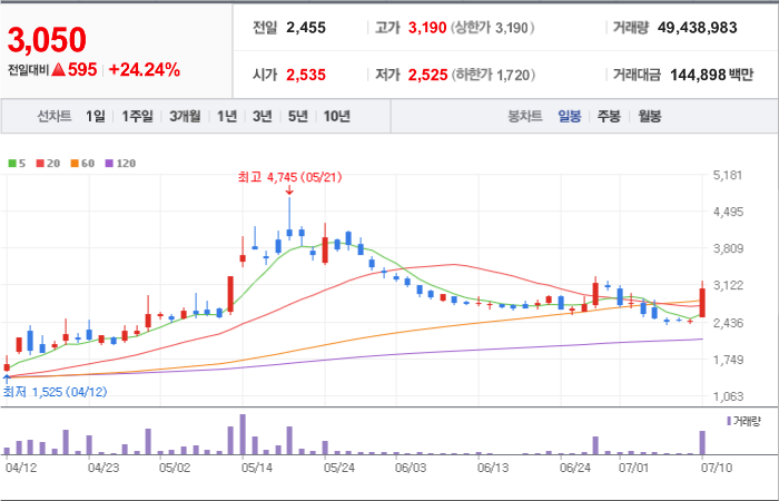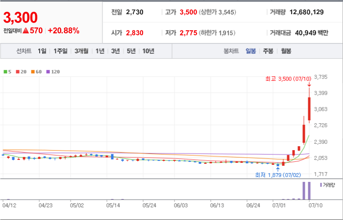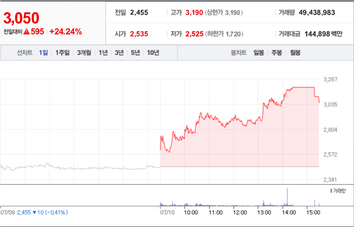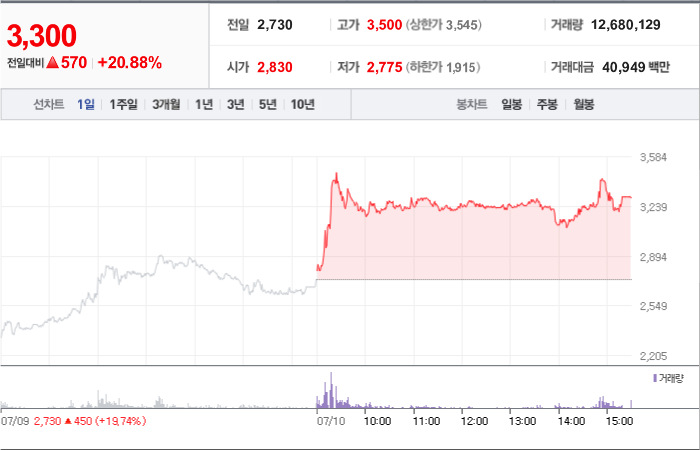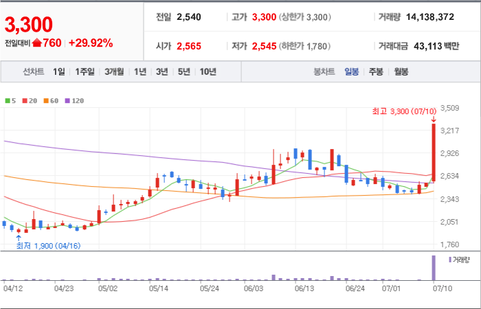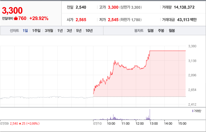 현재가: 3,300, 어제대비:+상한가