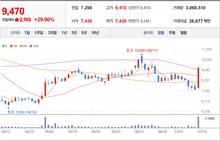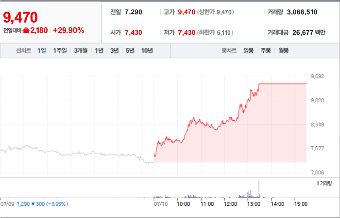 현재가: 9,470, 어제대비:+상한가