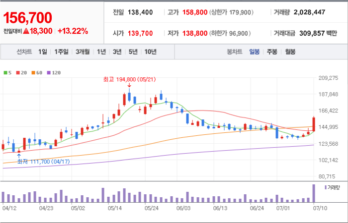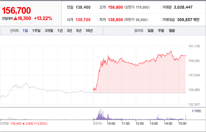 현재가: 156,700, 어제대비:+상승