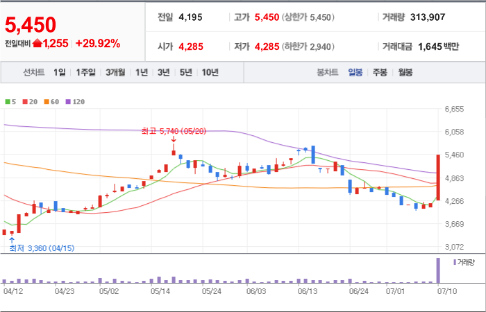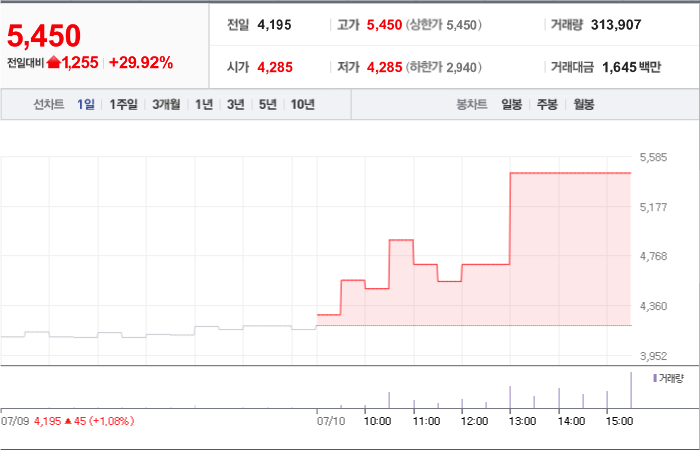 현재가: 5,450, 어제대비:+상한가