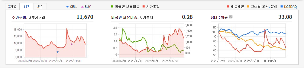 2024년 3월 전년동기 대비 연결기준 매출액은 46.3% 감소, 영업이익은 132.2% 감소, 당기순이익은 127.1% 감. 매출액이 감소했음에도 판관비가 160.3% 증가하며 영업이익에 악영향을 줌. 동사는 단순 외주 제작에 그치는 것이 아닌 판권과 2차 판매 수익을 극대화하기 위해 지식재산권(IP) 보유비율을 높이며 수익성 개선을 위한 노력을 진행하고 있음.