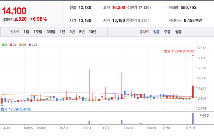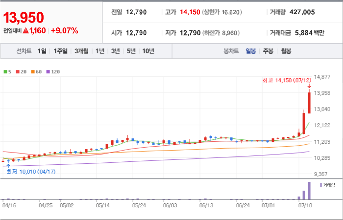 현재가: 13,950, 어제대비:+상승