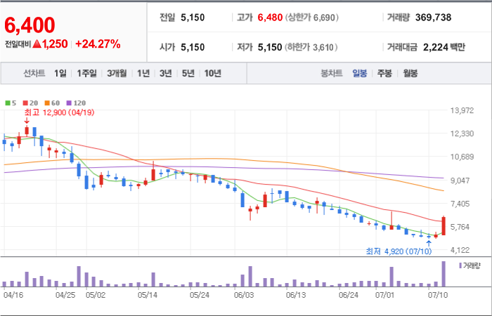 4,750시총: 3,175억원, 거래량:1,269,138, 거래대금:32,952백만