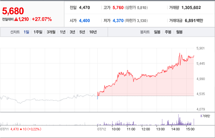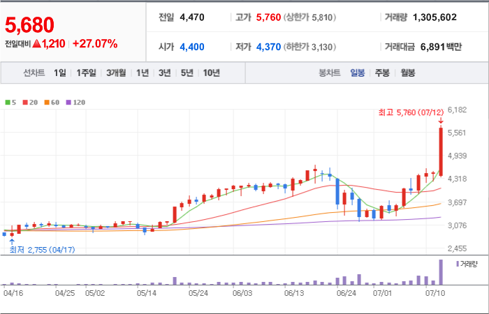 현재가: 5,680, 어제대비:+상승