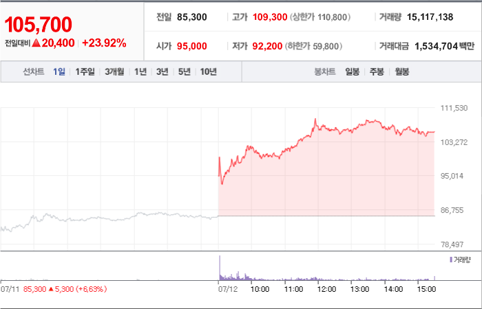 현재가: 105,700, 어제대비:+상승