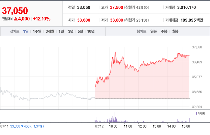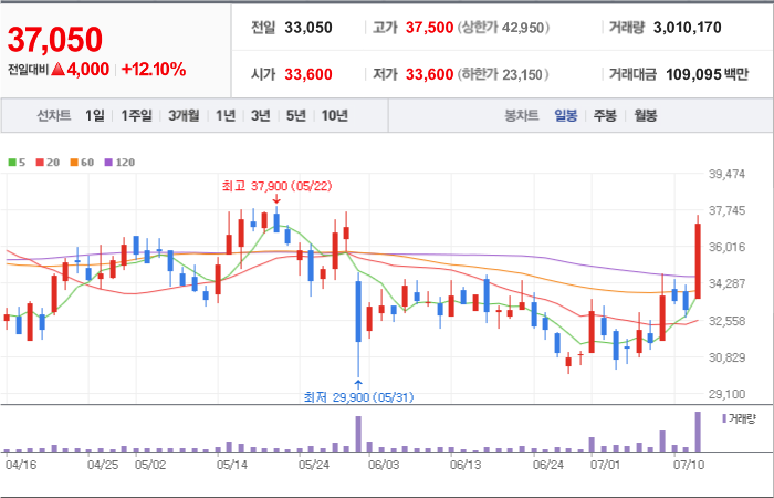 현재가: 37,050, 어제대비:+상승