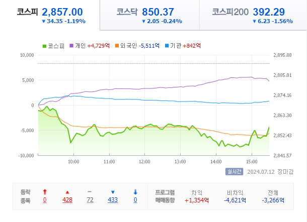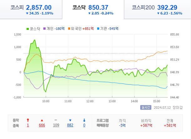 2024.07.12 15:43 / [코스닥 마감]외국인 매수에도 0.2% 하락…코오롱티슈진 ‘上’-이데일리 / https://n.news.naver.com/mnews/article/018/0005788351