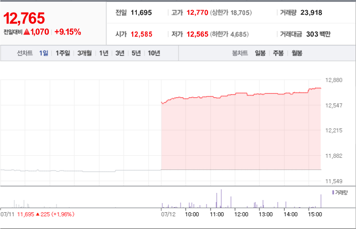 현재가: 12,765, 어제대비:+상승