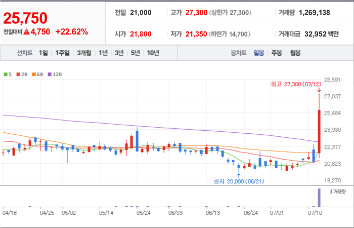 현재가: 25,750, 어제대비:+상승