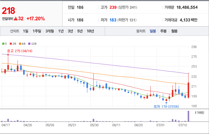 현재가: 218, 어제대비:+상승