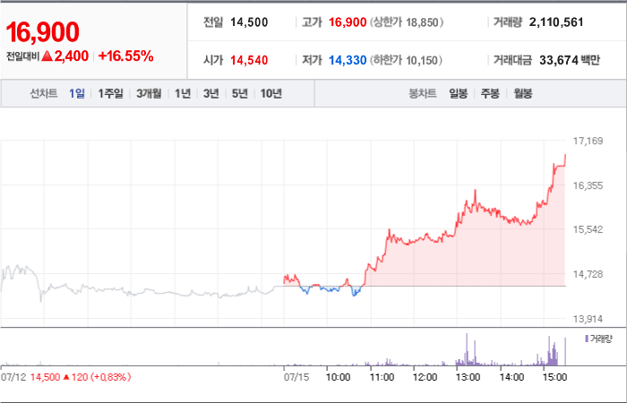 현재가: 16,900, 어제대비:+상승