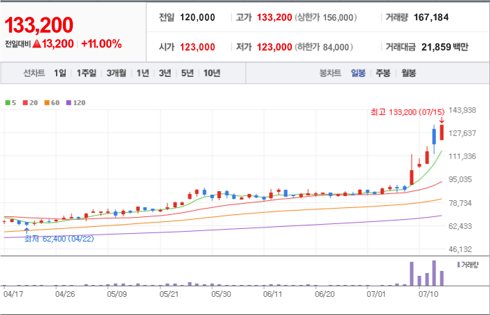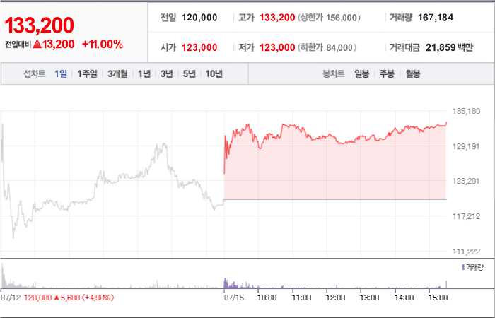 현재가: 133,200, 어제대비:+상승