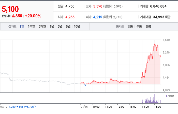 850시총: 914억원, 거래량:6,846,084, 거래대금:34,993백만