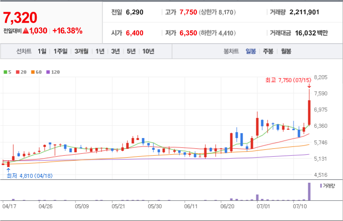 현재가: 7,320, 어제대비:+상승