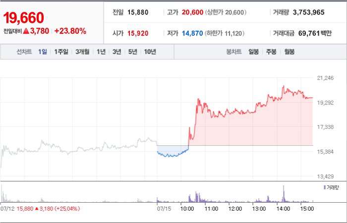 15. 한울소재과학 등락률: +19.29%