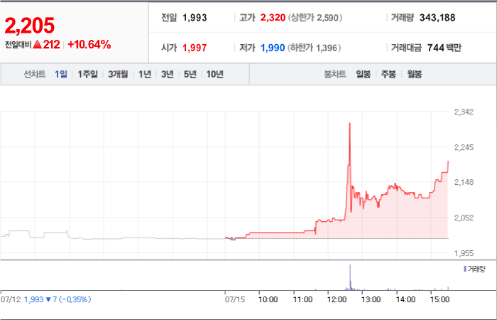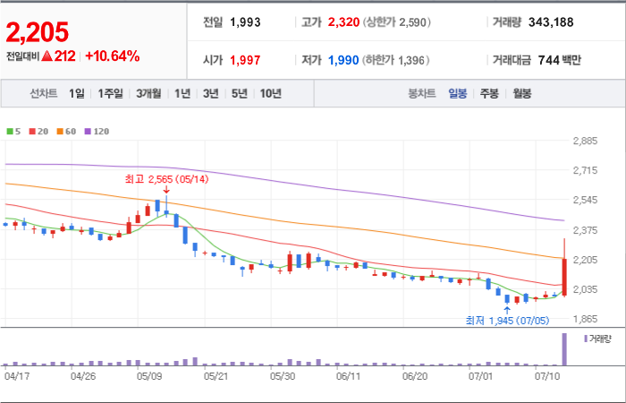 현재가: 2,205, 어제대비:+상승