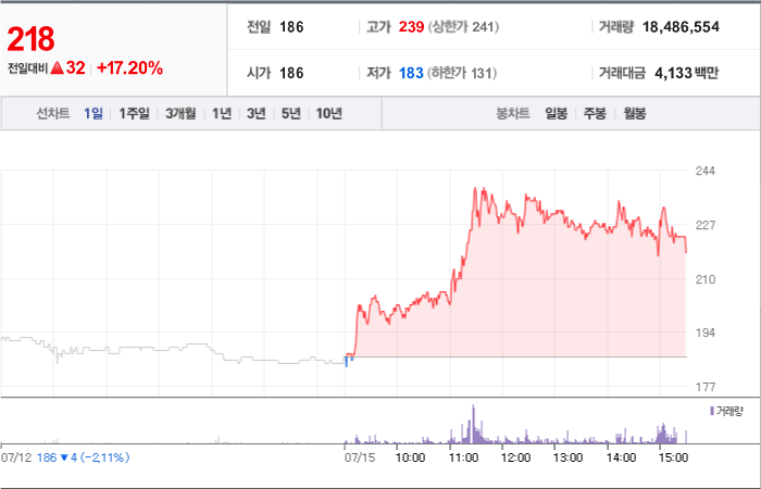 32시총: 156억원, 거래량:18,486,554, 거래대금:4,133백만