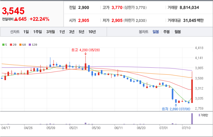 현재가: 3,545, 어제대비:+상승