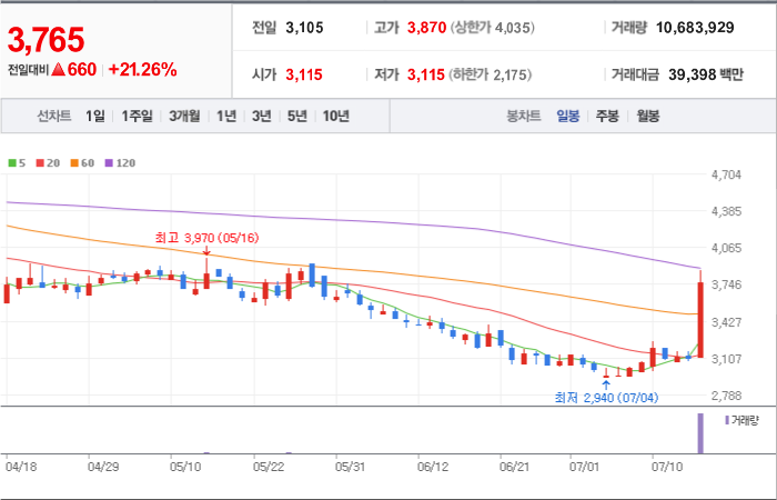 660시총: 696억원, 거래량:10,683,929, 거래대금:39,398백만