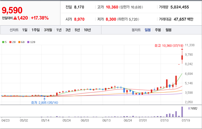 1,420시총: 706억원, 거래량:5,024,455, 거래대금:47,657백만