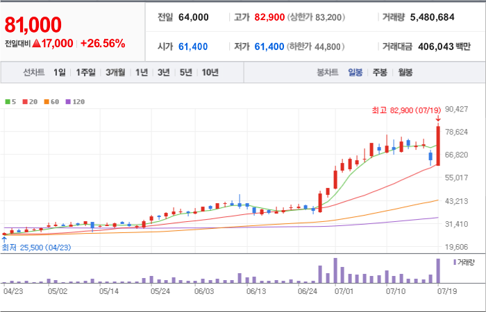 17,000시총: 1조 6,732억원, 거래량:5,480,684, 거래대금:406,043백만