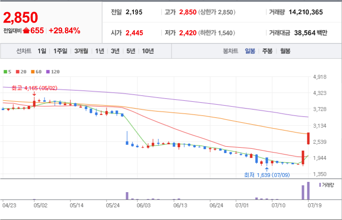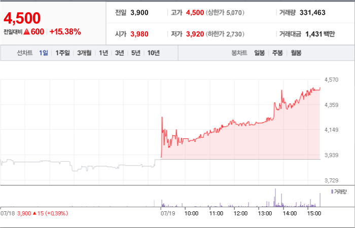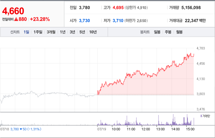 4,450시총: 2조 1,381억원, 거래량:867,583, 거래대금:42,850백만