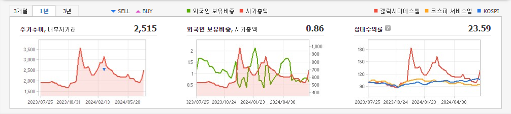 2024년 3월 전년동기 대비 별도기준 매출액은 11.9% 증가, 영업이익은 123.7% 증가, 당기순이익 흑자전환. 프리미엄 피트니스, 스포츠 및 오락관련 서비스 사업부문의 점진적인 동반 성장으로 원가율 상승에도 매출 증가를 기록함. 갤럭시아스포츠 골프연습장, 휘트니스, 사우나 등 레져사업을 운영하며, 새로운 스포츠마케팅 분야에 도전. 신규사업 관련 재고자산 취득등으로 인해 현금및현금성자산은 전기대비 54억원 증가.