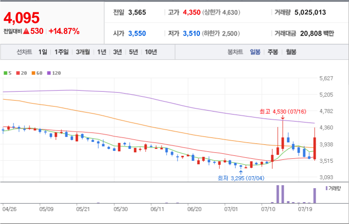 현재가: 4,095, 어제대비:+상승