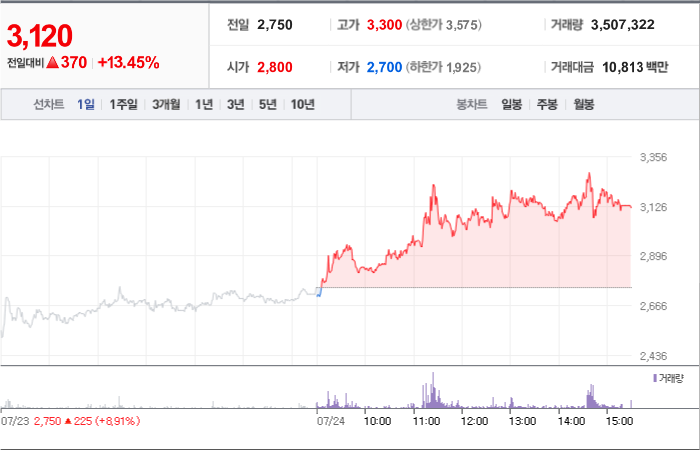 현재가: 3,120, 어제대비:+상승