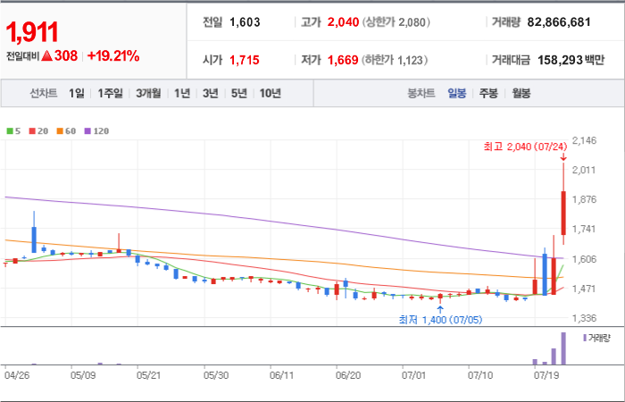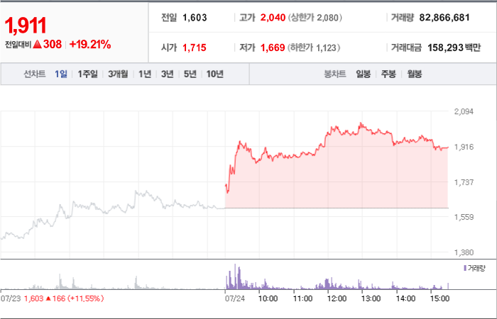 2,000시총: 4조 2,035억원, 거래량:15,514,154, 거래대금:340,541백만